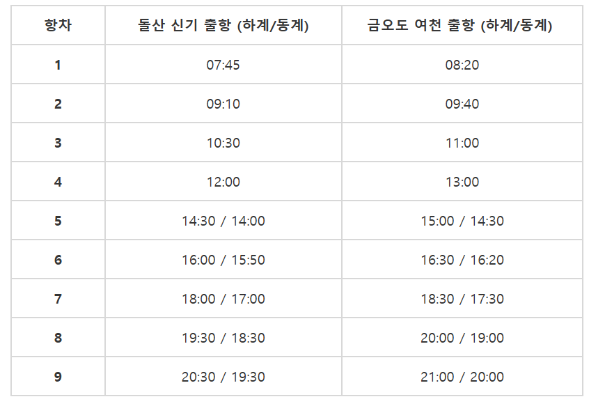 여수 금오도는 자연 그대로의 풍경과 해안 산책로, 수산 자원 등 매력적인 요소가 가득한 섬입니다. 그만큼 접근성도 중요한데 신기항- 여천선착장 금오도 구간을 연결하는 여객선 정보를 사전에 잘 파악하고 준비한다면 더 즐겁고 안전한 섬 여행이 될 것입니다. 배편이 많지 않고, 예약도 어려운 경우가 있으니 출항 1시간 전 도착은 필수라는 점도 기억하시기 바랍니다.